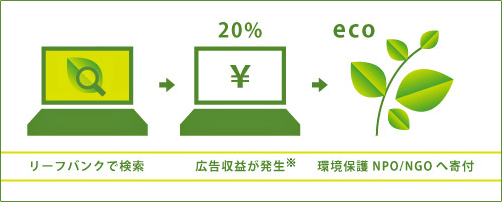 | 検索によって生じる広告収益の20%が、 環境保護NPOに寄付されます。 リーフバンクのサイト内、もしくは、専用の検索ツールバー内の検索ボックスでインターネット検索をおこなうと、 その一回一回に対して広告料が発生します。 リー フバンクでは、この広告収益の20%を、緑化事業等を推進する環境保護NPOに寄付、 残りをサービス運営や拡充に充てます。 |